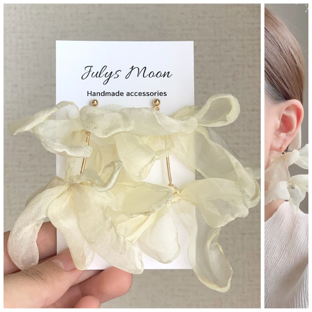 ☆ 必ず金具選択欄より金具の選択後ご購入お願いいたします。システム上、備考欄に記載頂きましても変更することが出来ませんのでご注意下さい。 ☆ ご購入前にSHOPPING GUIDEを必ずご確認お願いいたします。 サイズ(ピアス金具を含めない):長さ約5.0cm 金属のカラー:ゴールド 素材:金属、オーガンジーリボン ※ 写真は金属ポストピアスです。 ● ご注意事項 ・一つ一つ心を込めて作成しておりますが、素人のハンドメイドということにご理解ある方のみご購入お願いします。 ・パーツは元々バリや傷などがある場合があります。 ・お使いのモニター照明によっては実物とカラーの見え方が異なる場合があります。 ・◯日迄に必ず届くというお約束は出来ません。また、なるべく早く発送してほしい等のご要望承れません。 ・ポストピアスをご希望の場合もぶら下げ式になります。 ・背景等の飾りは付きません。 ・パーツ等で使われている金具はアレルギー対応ではありません。 ・繊細な商品ですのでお取り扱いは優しくお願いいたします。 ・パーツはダメージや解れがある場合がございます。予めご了承下さい。